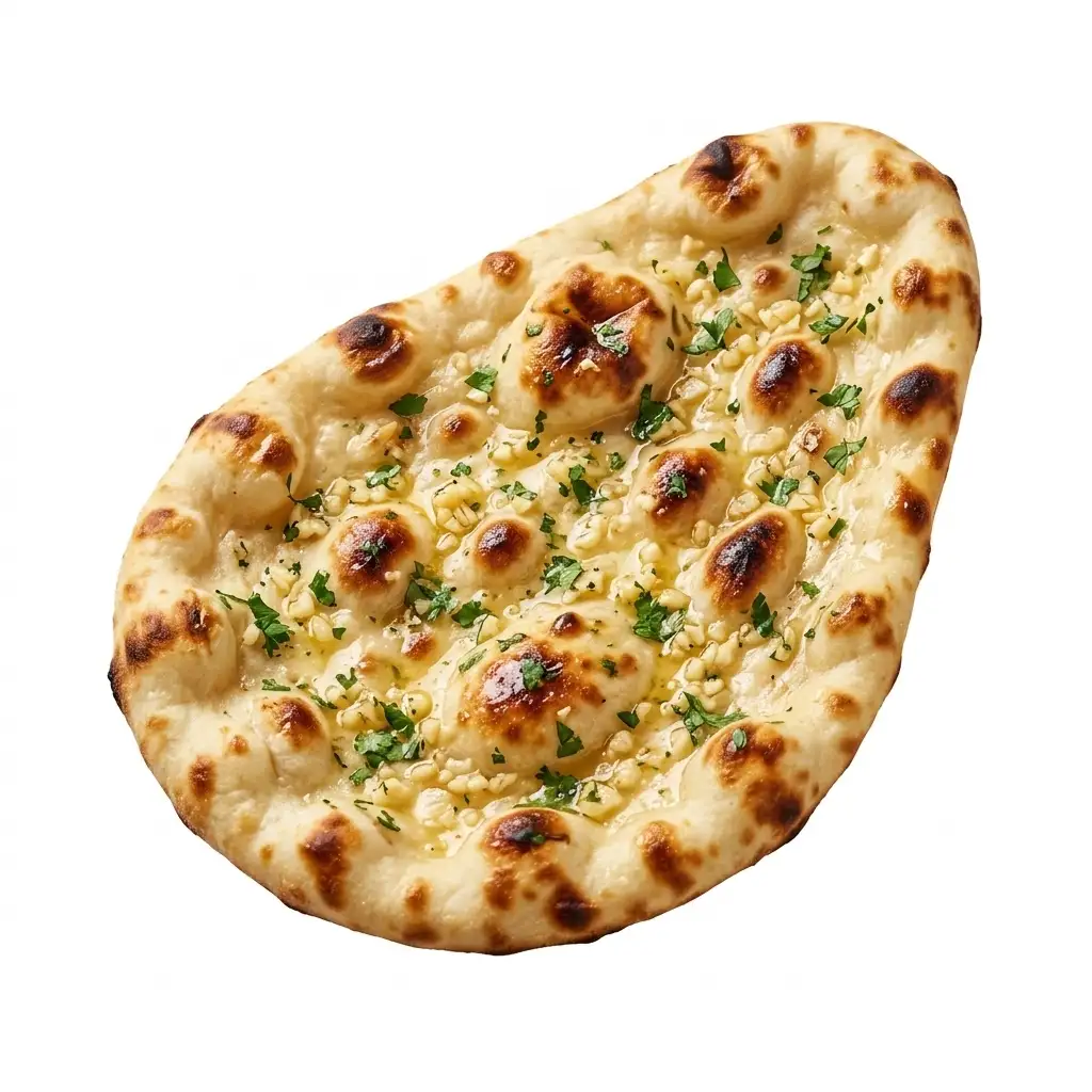 Warm, pillowy naan loaded with roasted garlic and fresh cilantro, finished with a generous brush of salted butter. Crisp on the edges, soft in the center.