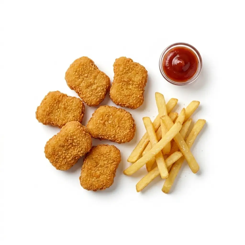 Crispy, golden chicken nuggets served with warm, lightly salted chips. A kid‑favorite meal that's just the right size. Served with ketchup or BBQ dip.