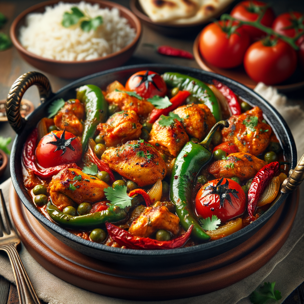 A very popular dish cooked in spicy sauce with chunk peppers, tomatoes and a blend of onions, green chillies, ginger and fresh herbs.