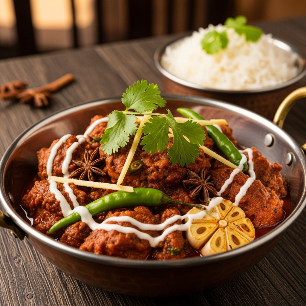 Dish cooked with garlic, ginger, coriander and special spices finished off with yoghurt and aniseed.