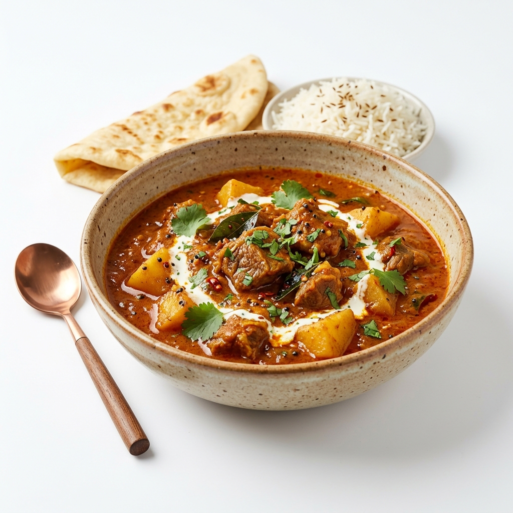 Cooked in a hot sauce but less hot than vindaloo