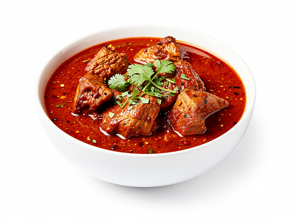Cooked in an extremely hot sauce with fried potatoes, chillies. Suitable for people with a strong constitution.