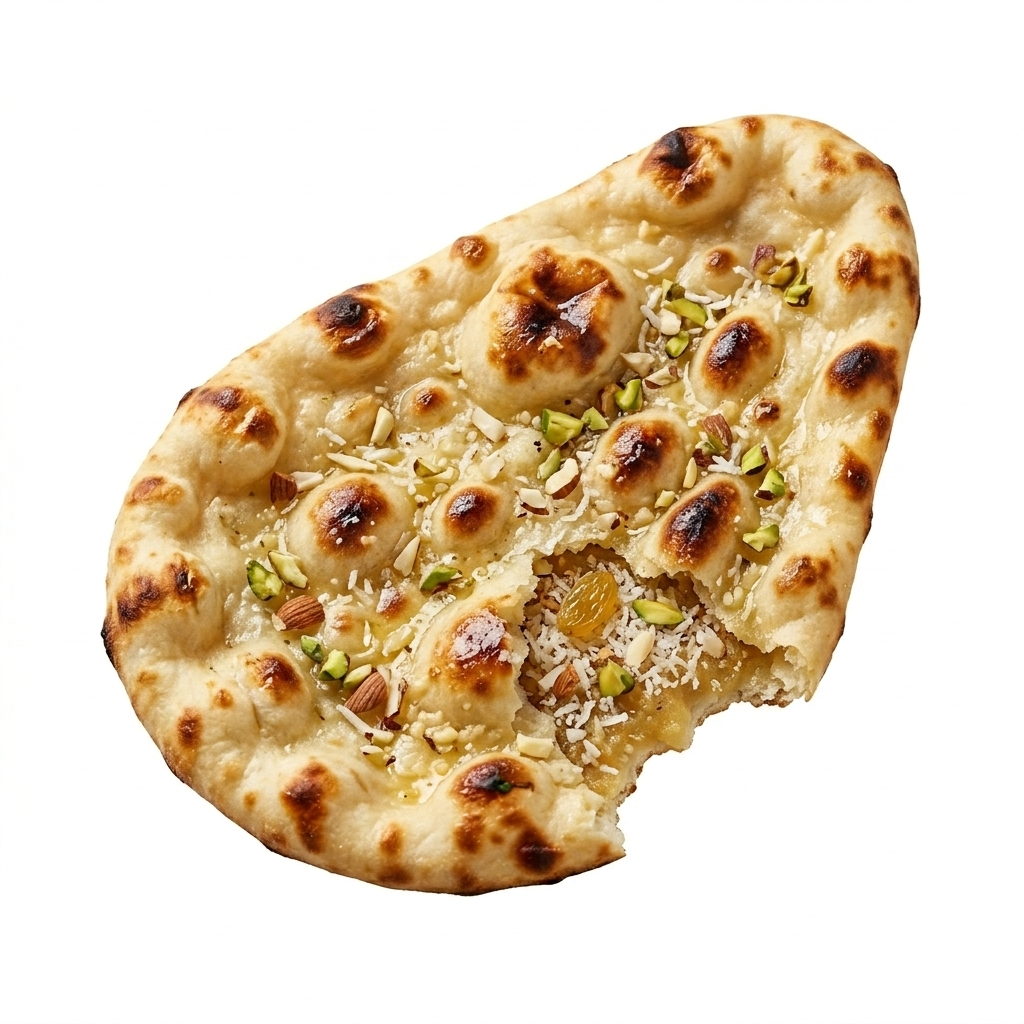 Sweet and nutty Peshwari naan — stuffed with desiccated coconut, crushed almonds, pistachios, and raisins, finished with melted butter. A perfect balance to spicy curries.