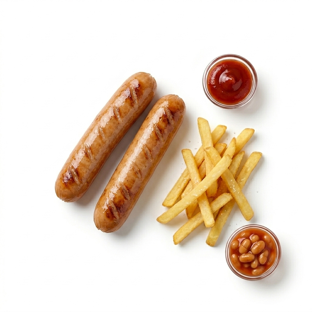 Two juicy, grilled sausages served with a side of golden, crispy chips. A simple, hearty favorite for little appetites