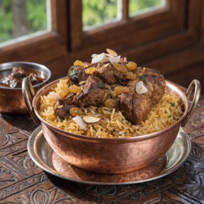 Dish cooked together with pilau rice, special biryani spices, herbs, sultanas, coconut, almond flakes & served with curry sauce.