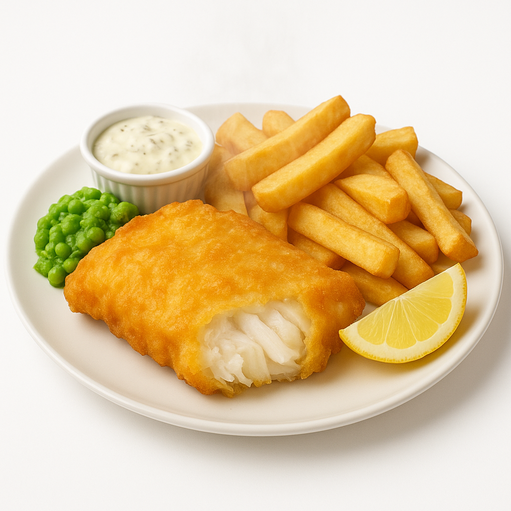 Fresh Cod and Chips, featuring a golden, crispy battered cod fillet with a light