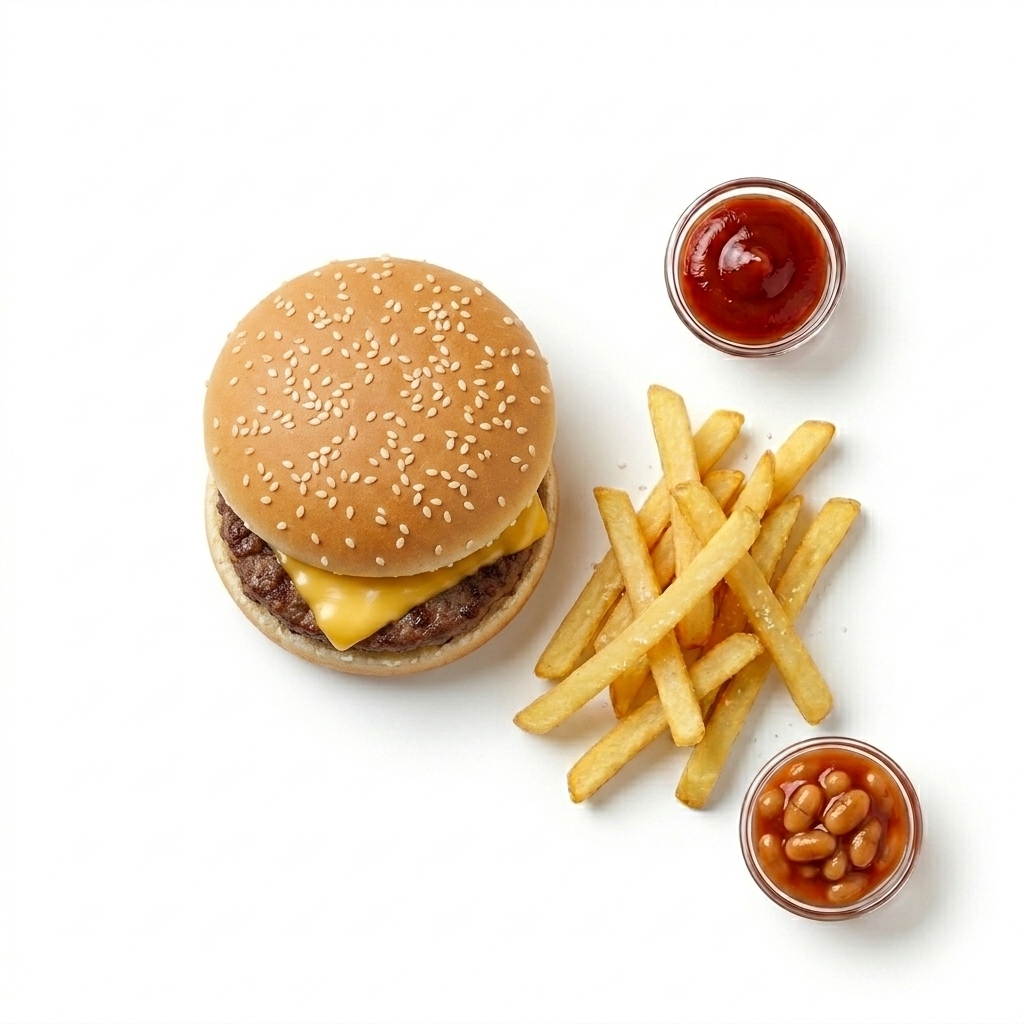 A juicy beef patty topped with melted cheese in a soft sesame bun. Served with golden, crispy chips. A classic kids' favourite.