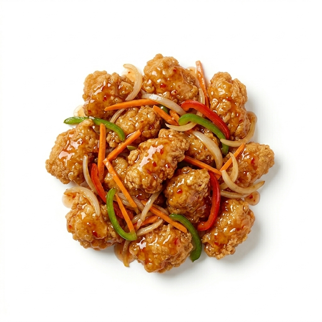 Golden crispy chicken wok-tossed with fresh onion, carrot, and mixed peppers in a sticky sweet chilli sauce. Sweet, tangy, and irresistibly crunchy